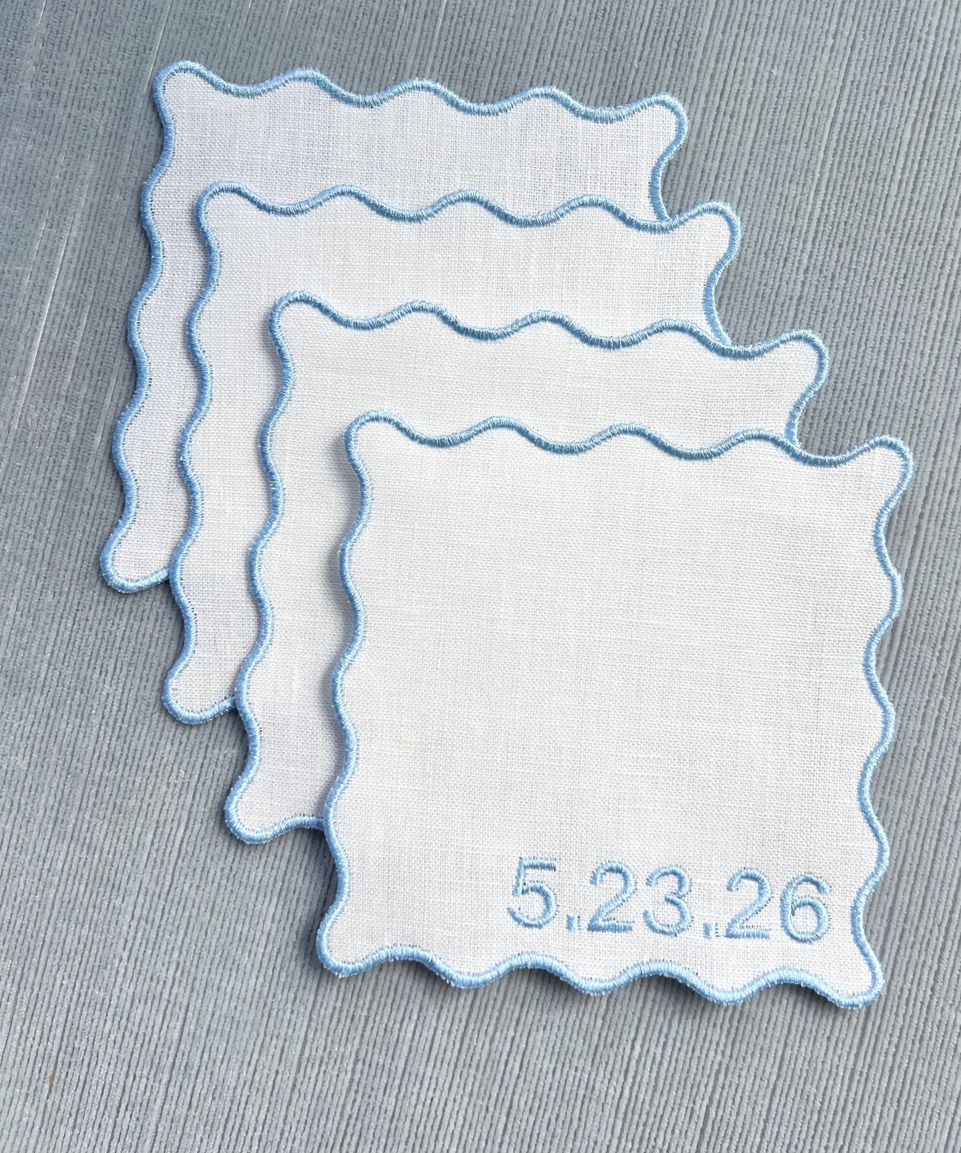 A timeless keepsake for life’s most celebrated moments. Expertly tailored from sumptuous European linen, these bespoke cocktail napkins commemorate your most meaningful dates—be it an engagement, a milestone birthday, or the day you said “I do.”